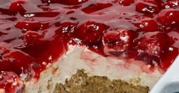 This creamy, cherry-topped dessert has been a family favorite for generations — buttery graham cracker crust on the bottom, a rich cream cheese layer in the middle, and glossy cherry pie filling on top. It’s cool, velvety, and sweet with just the right balance of tartness from the cherries.